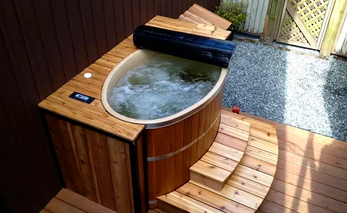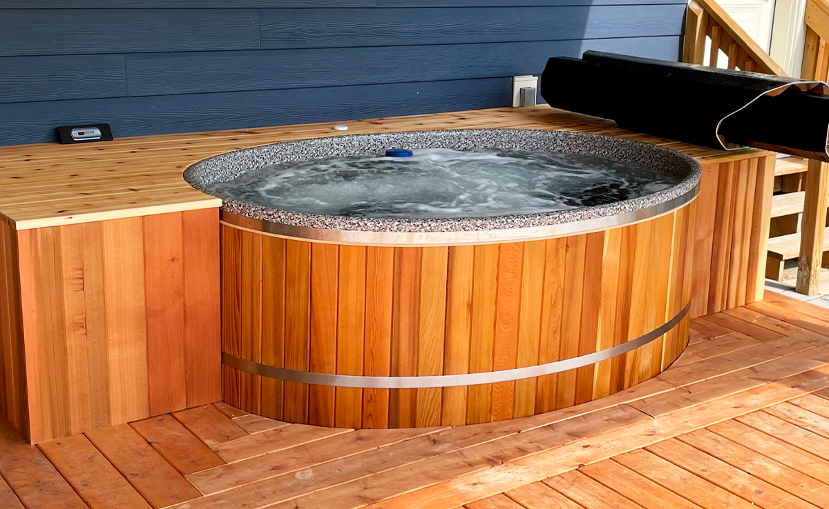 A sleek, contemporary cedar hot tub built for comfort and durability. Perfect for relaxing and entertaining in any outdoor space.
